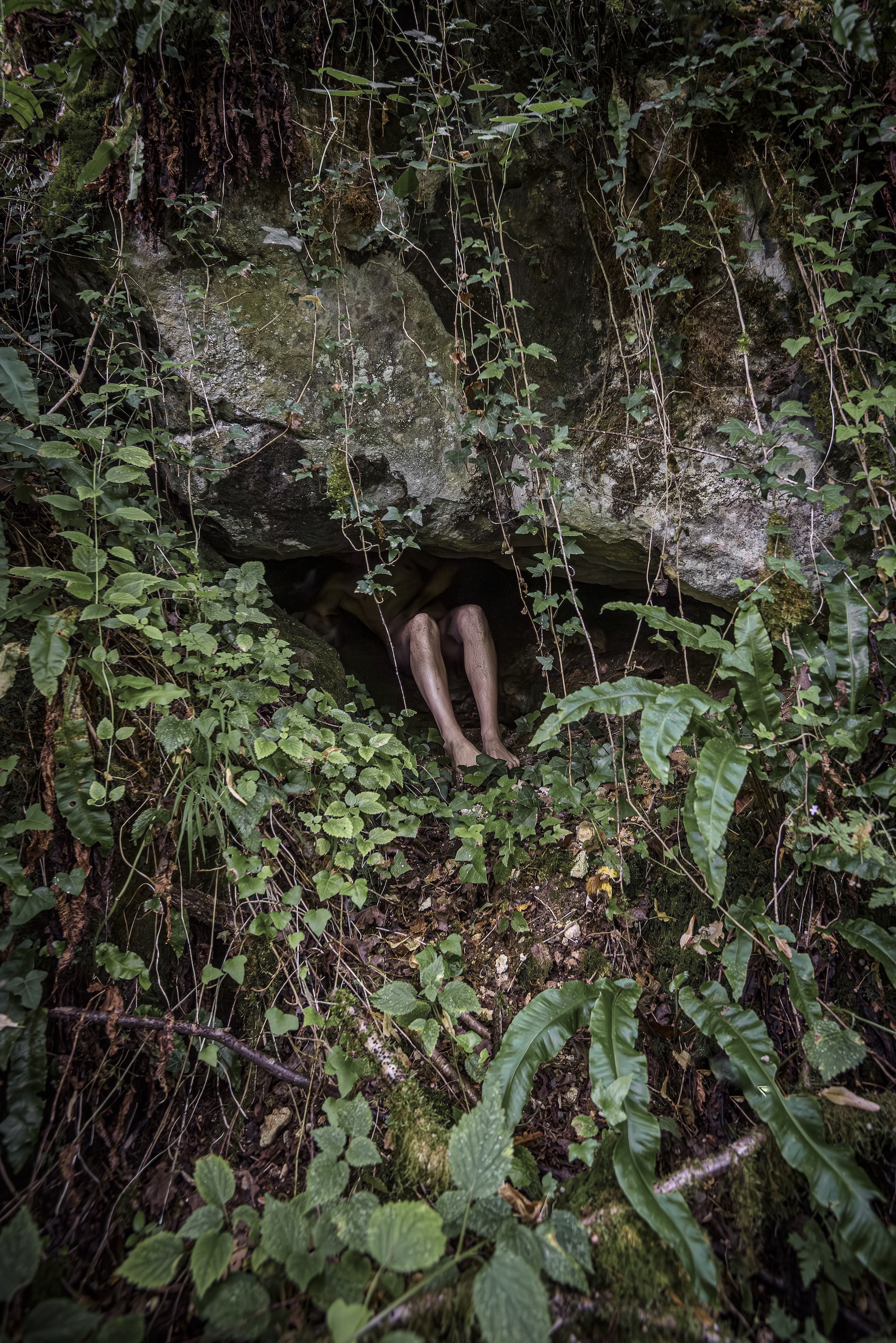 Dans Symbiose, l’Homme, sous les traits d’un corps androgyne et nu, disparaît presque derrière la nature, se fond en elle tout en restant intimement lié à son environnement. Le visage, presque toujours caché, invite chacun à se projeter et à s’identifier à cette connexion originelle. Chaque position symbiotique illustre une relation réciproque, où l’homme et la nature s’entrelacent, se nourrissent et se complètent.